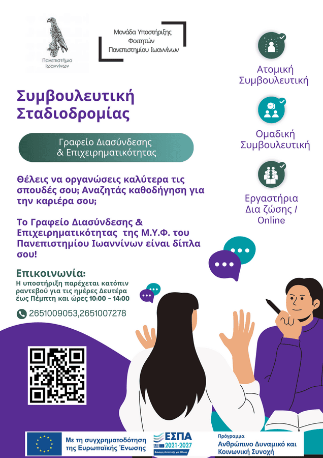 Μια νέα ακαδημαϊκή χρονιά ξεκινάει και η Μονάδα Υποστήριξης Φοιτητών (Μ.Υ.Φ.)- Γραφείο Διασύνδεσης και Επιχειρηματικότητας είναι εδώ για να υποστηρίξει τους φοιτητές/ριες και απόφοιτους του Πανεπιστημίου Ιωαννίνων σε θέματα σταδιοδρομίας.